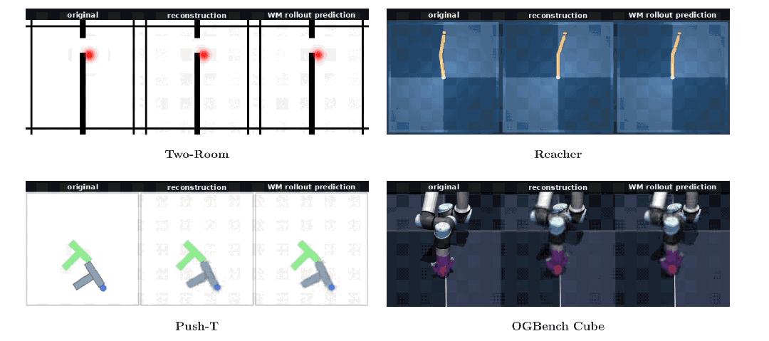 可以看到,LeWM不仅能准确理解当前场景,还能正确预测物体接下来的运动,真正抓住了环境的核心结构与变化规律。