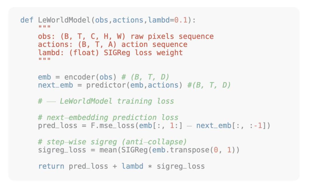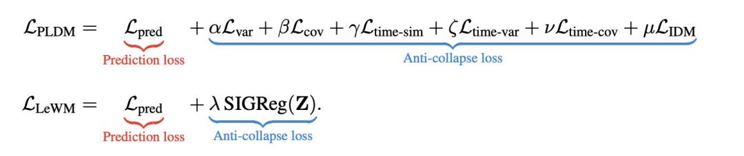 SIGReg正则损失:强制让所有特征向量服从标准高斯分布。作用是防止模型 “摆烂坍塌”(所有画面输出一样的特征)。