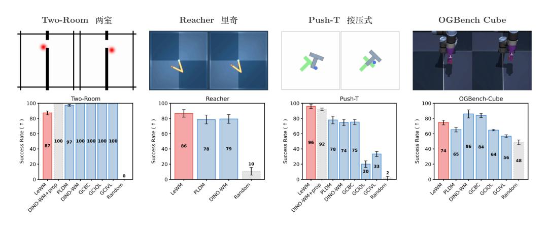 4个任务分别是Push-T(推箱子)、Reacher(机械臂够目标)、OGBench-Cube(3D 机械臂抓方块)、Two-Room(2D 导航)。