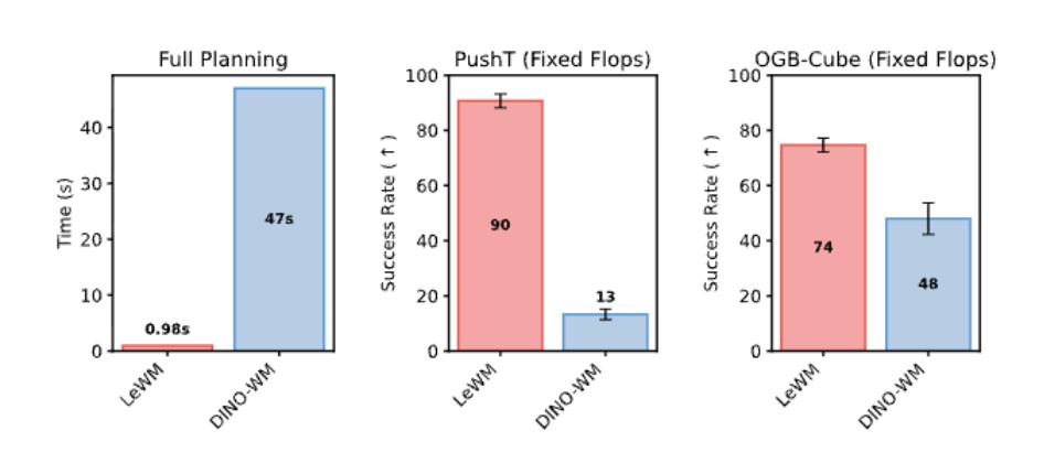 值得注意的是,LeWM的规划速度比DINO-WM快48倍:不到1秒vs约47秒。
