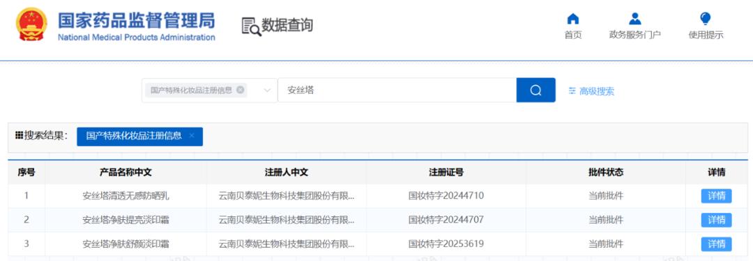 具体来看,安丝塔已有数十款产品的注册备案记录,其中包括3款特殊化妆品,主要涉及祛痘、修护、舒缓品类。