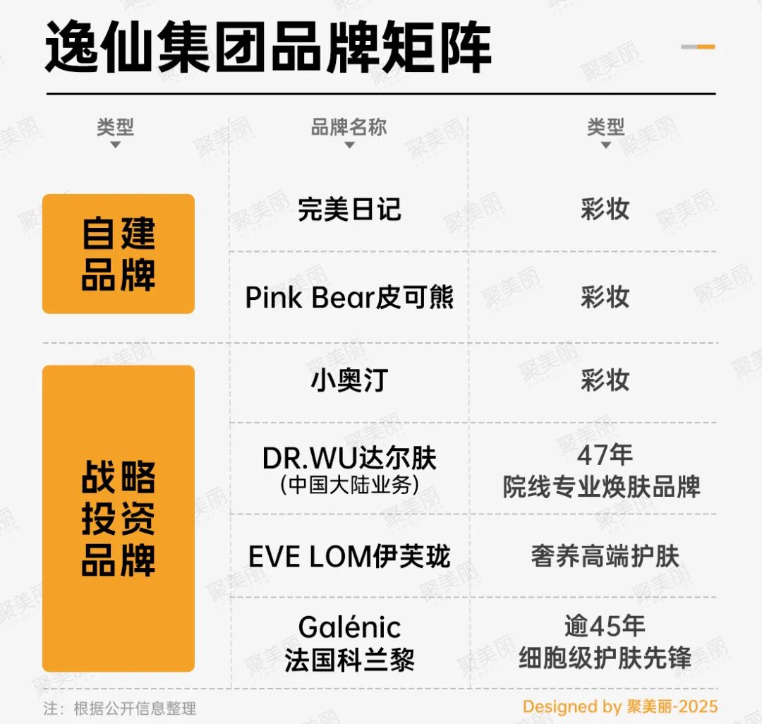 而同样打造出“彩妆+护肤”品牌矩阵的逸仙集团,其旗下子品牌如彩妆品牌Little Ondine小奥汀、护肤品牌EVE LOM伊芙珑、Galénic法国科兰黎、DR.WU达尔肤等,也均通过投资收购方式引入。