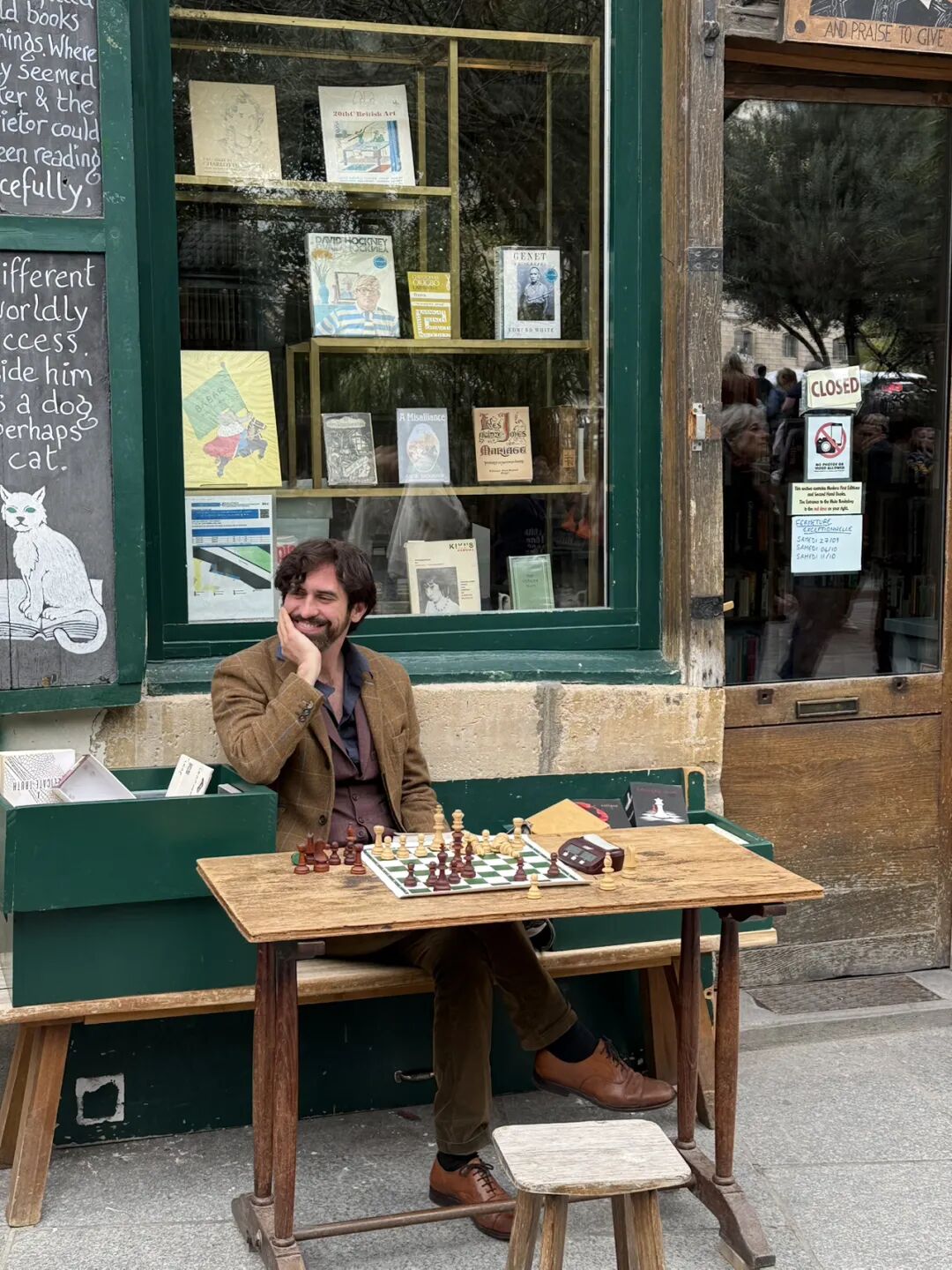 一旁的莎士比亚书店,书店内外氛围极好,等待别人来对弈国际象棋的小哥,等来了寻他一起拍照的路人,脸红得像立正站好的番茄。