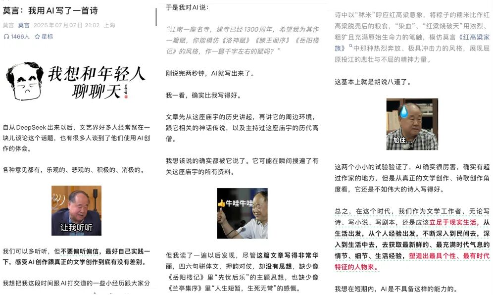 作家莫言曾于2025年7月将自己的演讲内容发到公众号,题为《我用AI写了一首诗》,文章讲述称通过和AI软件的5次对话,他感受到了AI的古言诗作创作能力。他的体会是“单就写‘赋’来讲,99%的作家不如它”,但莫言也认为目前AI写的诗是“陈词滥调”“没有创造性”,有一篇和自己的作品相关的“注”更是“胡说八道”。
