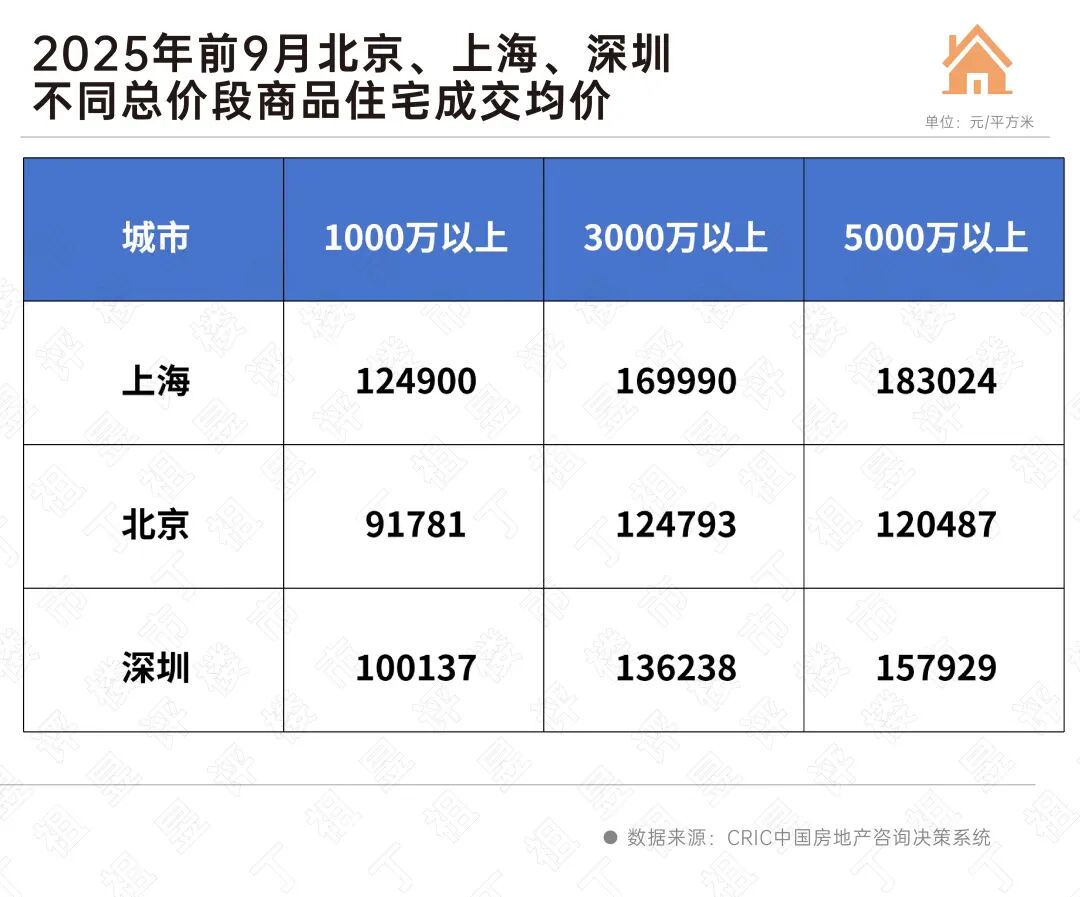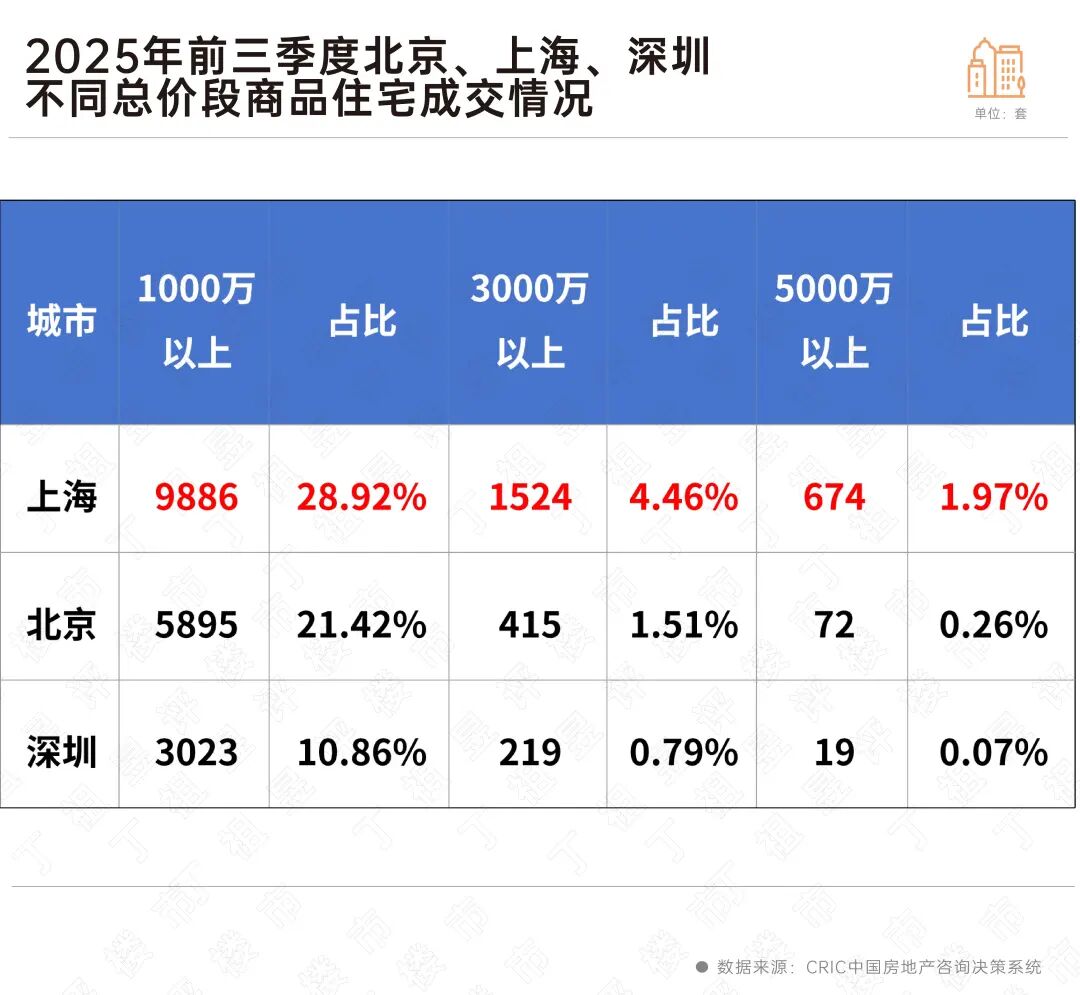 2025年前三季度,上海总价3000万以上商品住宅成交1524套,5000万以上成交674套,皆高于北京和深圳套数之和。