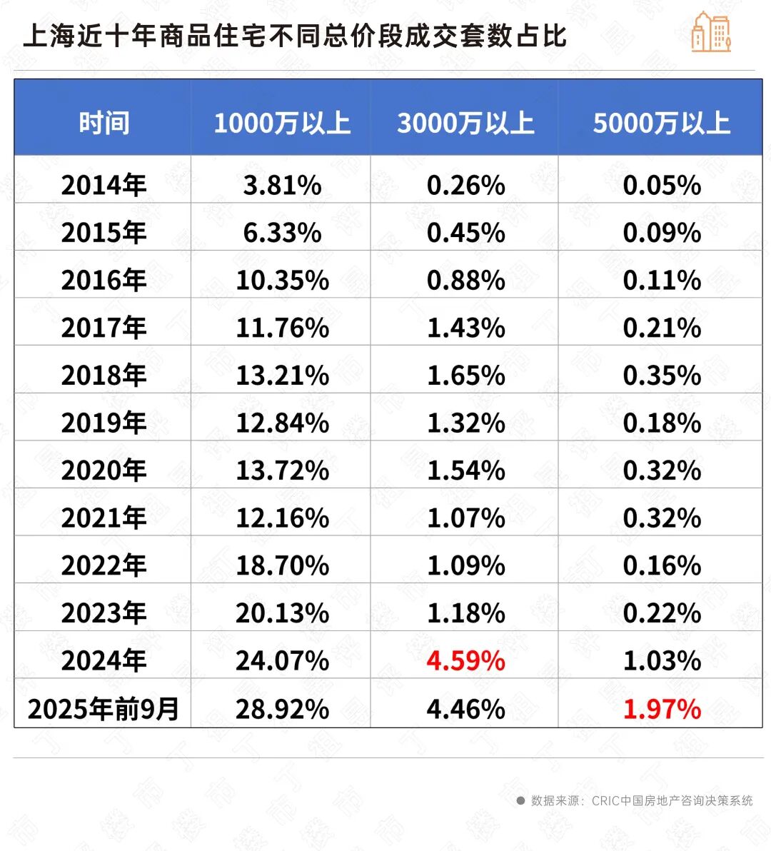 进入2025年,前9月3000万以上成交占比与2024年全年接近,5000万以上成交再次跃升至1.97%。