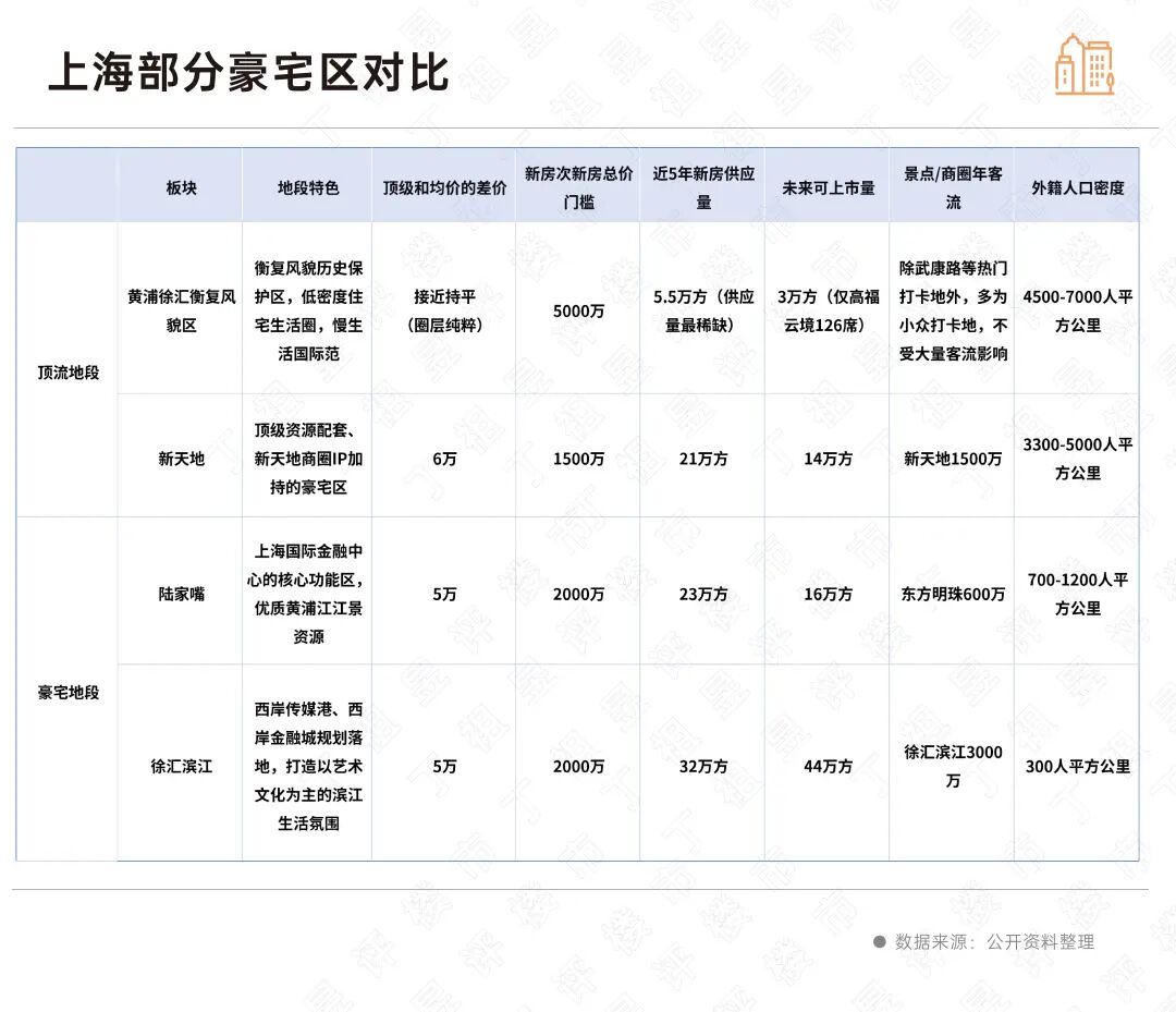 接着说,进一步细分板块可以看到,上海最顶流的豪宅地段主要集中在衡复风貌区、新天地、陆家嘴和徐汇滨江等。