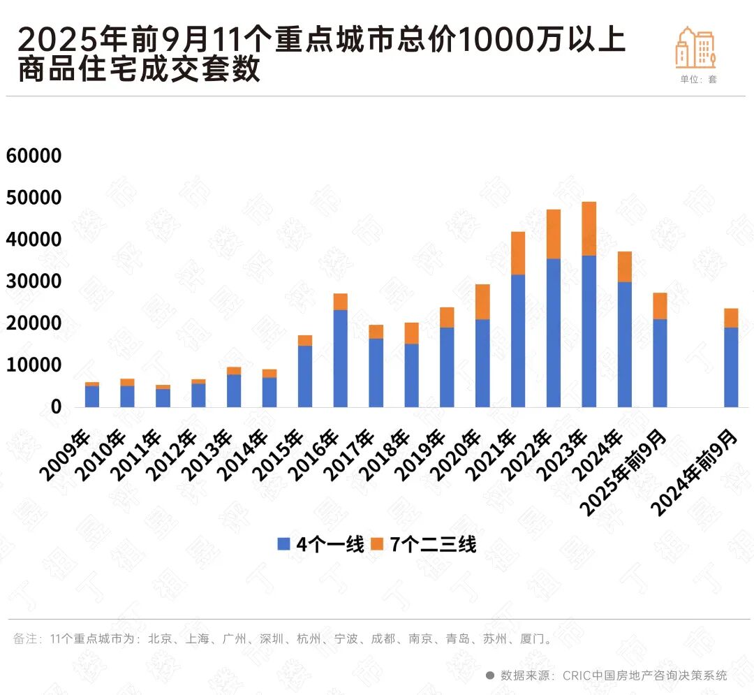前三季度,11个重点城市总价1000万以上商品住宅共成交27372套,较2024年同期增长15.6%。