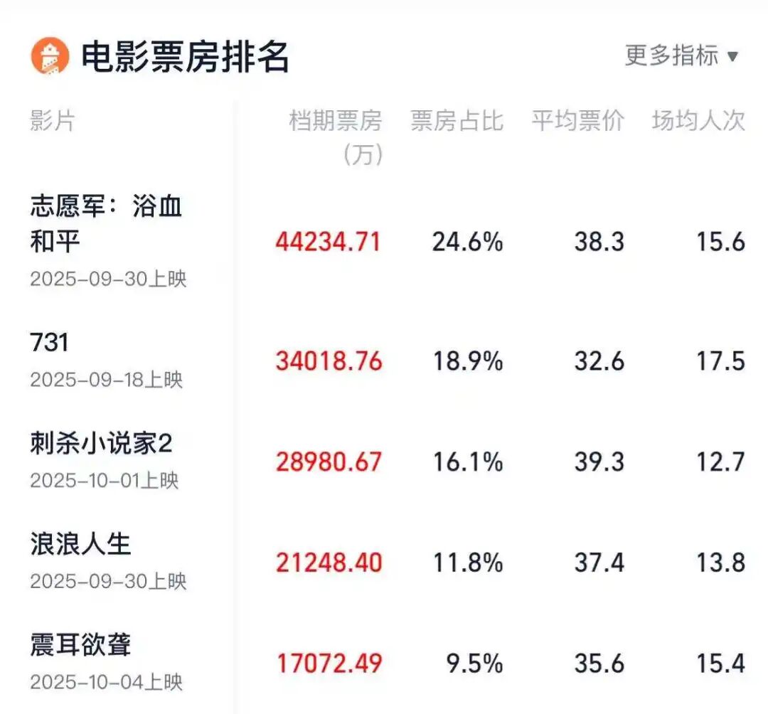《志愿军:浴血和平》虽位居档期榜首,但不足5亿的票房表现,与往年同档期的头部影片相比存在显著差距;而已经上映一段时间的《731》竟能稳坐第二把交椅,这个现象折射出今年国庆档新片整体吸引力的不足。