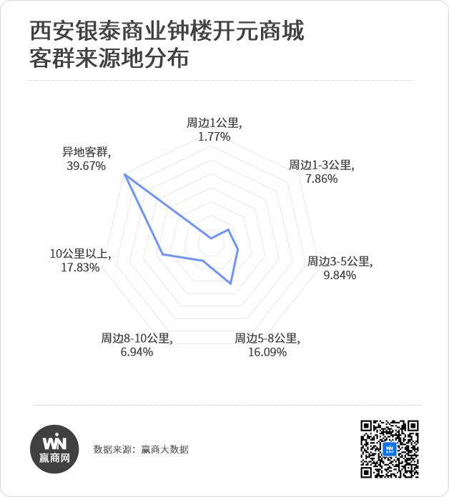 凭借约20万㎡的超大体量,赛格打造了大而全的业态组合,满足本地客群的多样化需求,同时辐射西北其他城市,异地客群占比35.86%,其中咸阳、渭南、榆林占比排前三。