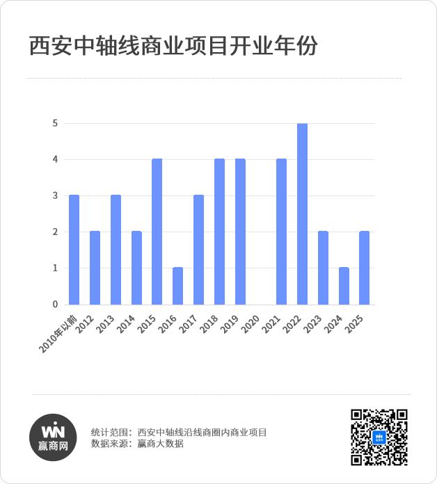据赢商研究中心统计,西安中轴线现存商业绝大多数开业于2011年后,即地铁开通后,几乎每年都有新开或改造焕新的商业项目。