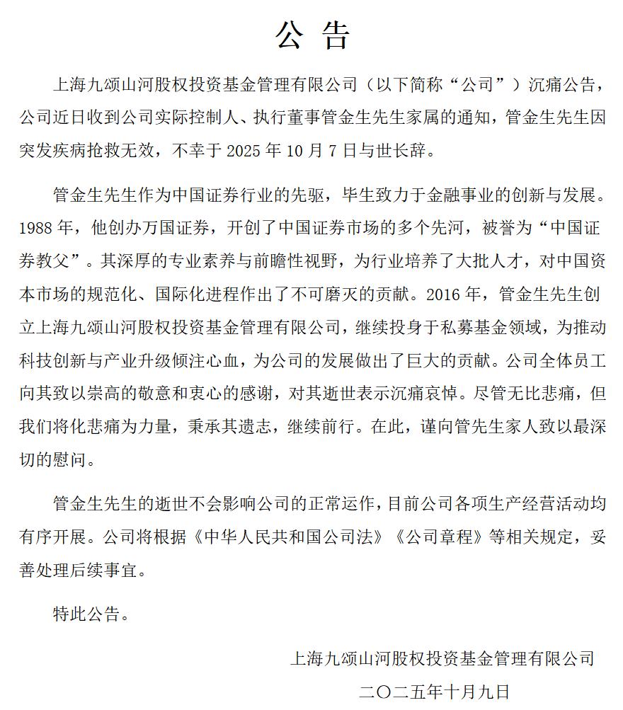 10月9日深夜,上海九颂山河股权投资基金管理有限公司(下称“九颂基金”)发布公告,公司实际控制人、执行董事管金生因突发疾病抢救无效,不幸于2025年10月7日与世长辞,享年78岁。