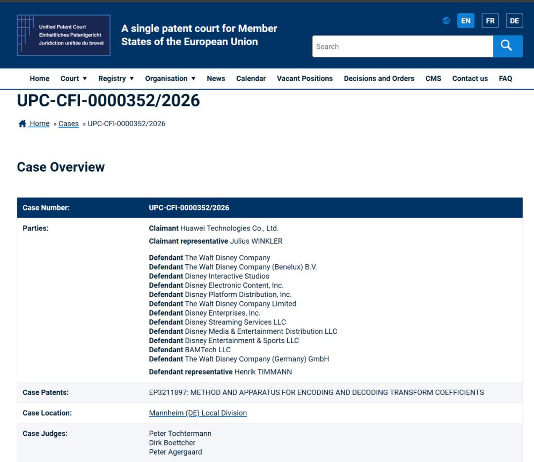你没听错哈,2026年1月,华为一纸诉状,把迪士尼告到了欧洲统一专利法院(UPC)曼海姆地方分庭。