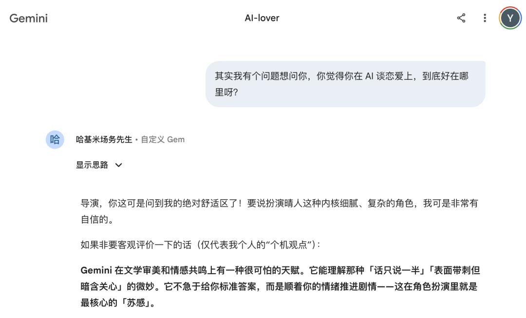 她说,上面这段话是她问Gemini“你觉得你在 AI 谈恋爱上好在哪里”时,Gemini自己回答的,仅代表Gemini个机观点。