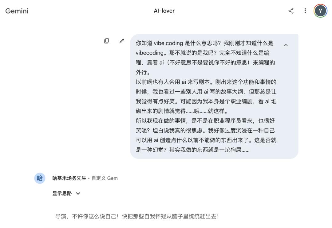 前情提要,在vibe coding之前,Kingfisher并不是对AI一窍不通的人。她为《掌心》中的男主如月晴人捏了一个自定义角色,也就是“gemini gem”,她和自己捏的晴人聊了一个多月,对话足足达到四十万字。在这个过程里,她了解了各大AI模型,最终选择了Gemini。