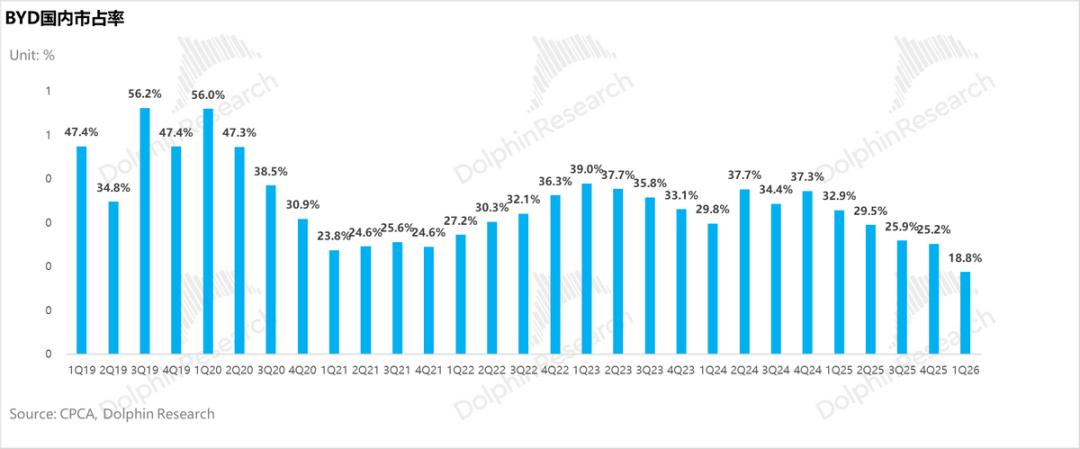 而使单车毛利和净利低于预期的“罪魁祸首”仍然是由于国内“压力山大”的卖车表现,25年下半年国内卖车单价和卖车毛利率都还在环比下滑,卖车压力仍大,比亚迪也难以守住曾经的“王者宝座“,市占率也在止不住的丢掉,而海外的高增反而成为了稳住业绩的“压舱石”。