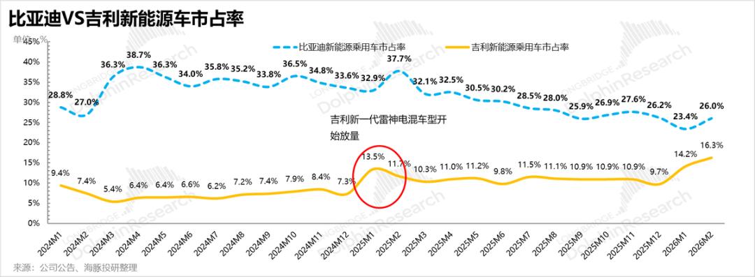 主流价格带面临结构性侵蚀:在10-20万元基本盘中,竞品展开“贴身肉搏”。吉利银河系列凭借“高配置+强性价比”策略抢占身位,销量近乎翻倍,带动吉利新能源市占率在2026年2月回升至16.3%。