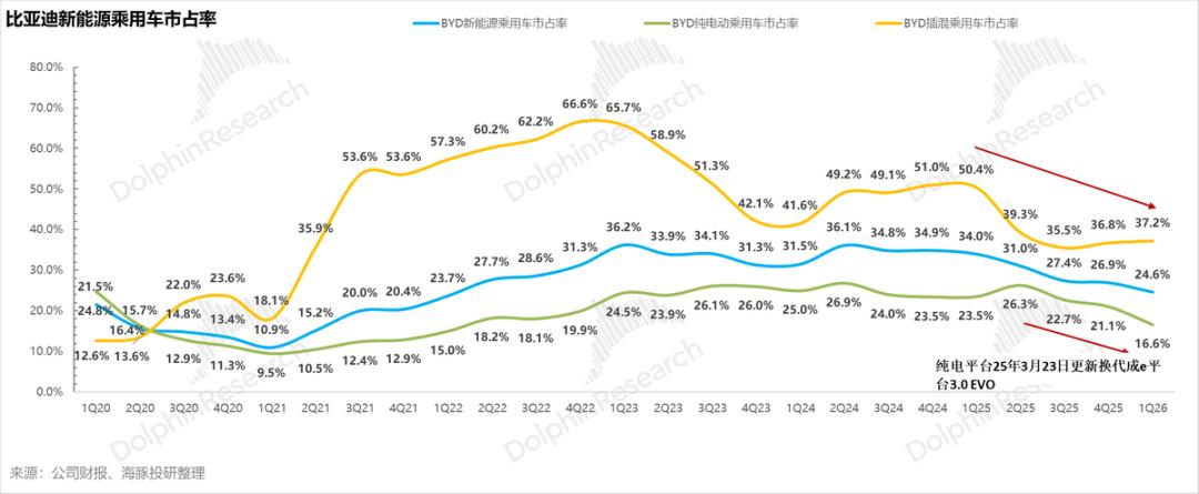 纯电车型面临更剧烈的缩量压力,市占率从2025年一季度的26.3%锐减至2026年1-2月的16.6%。2025年3月,比亚迪虽推出了搭载新一代超快充电池、高性能电机及SiC功率模块(支持1500V高压及200°C高温作业,实现“充电5分钟续航400公里”)的超级E平台,但该技术前期仅局限于汉L、唐L等20万元以上高端车型。由于核心技术未向走量车型下放,加之自营超充网络仍处建设爬坡期,未能有效阻击竞品在主流纯电市场的攻势。