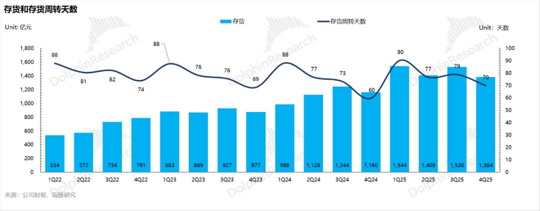 从比亚迪本季度自身的库存水位来看,二季度开始就已经在去库存,6月比亚迪通过实施“熔断”机制,精简SKU,加快返利等措施,存货周转天数从一季度库存高点90天逐步下滑到四季度70天,库存水位已经回复到合理水平,为26年的新品推出做准备。