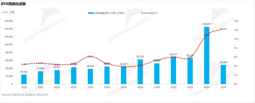 单从数据上看,2025年四季度比亚迪高端品牌矩阵(腾势、仰望、方程豹除钛3)合计销量达14.5万辆,环比实现近1.2倍的快速增长。高端车型在总销量中的占比,也从三季度的约6%快速跃升至接近11%,高端化战略似乎取得了突破性进展。