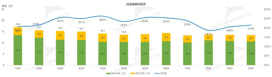 2. 卖车单价仍处于下行轨道:四季度,比亚迪卖车单价环比下滑1500元至13.5万元,主要由于清库存折扣压制结构改善红利(高端化+出海占比提升)。