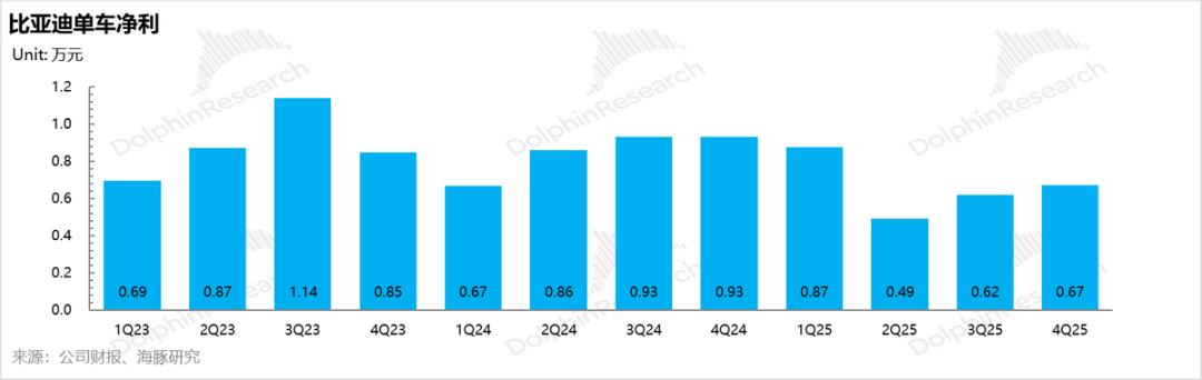本季度,比亚迪实现单车毛利 2.9 万元。尽管较上季度环比微升 0.1 万元(得益于规模效应带来的成本降幅略高于售价降幅),但由于终端降价促销仍在持续,单车降本的力度未能完全对冲价格下探的压力,最终导致单车盈利未能触达市场预期的 3 万元关口。