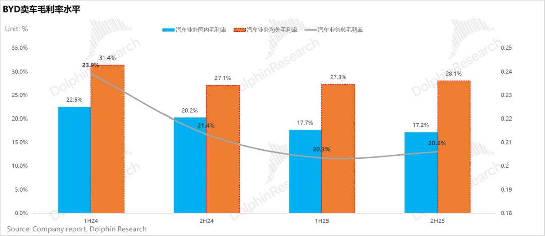反映在利润率端,四季度整车销售毛利率 21.6%,同样低于市场 22.5% 的一致预期。深入拆解来看,整体毛利率的承压主要源于国内市场的持续内卷,而海外高盈利则再次扮演了“救驾”的角色:
