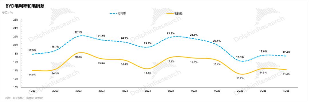 4. 卖车毛利率虽在回升,但幅度不够:市场本来认为由于反内卷下价格战趋缓,叠加四季度规模效应有一定释放,加上海外卖车高增带来的对利润端贡献,卖车毛利率能环比回升至少2个百分点至22.5%。