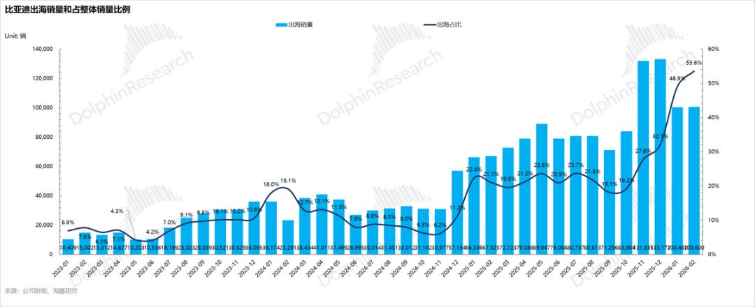 进入2026年,在1-2月国内大盘因购置税退坡等因素承压之际,海外销量依然维持同比高增态势,其占总销量的比重一度飙升至51%,形成了极强的结构性支撑。