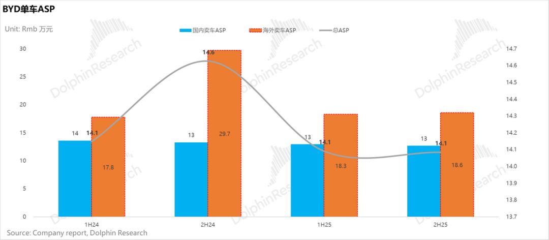 25年下半年比亚迪海外车型ASP高达18.6万元(环比提升0.3万元),是国内车型ASP(环比下滑0.3万元至12.7万元)的约1.5倍。