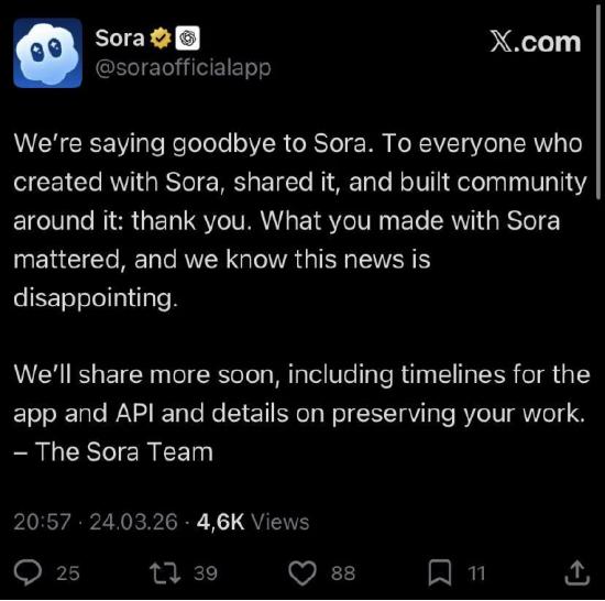 3月25日,OpenAI宣布关停Sora——那个让贾樟柯说“确实厉害”、让整个影视行业集体焦虑的AI视频工具,上线仅半年就被创造者亲手关掉了。
