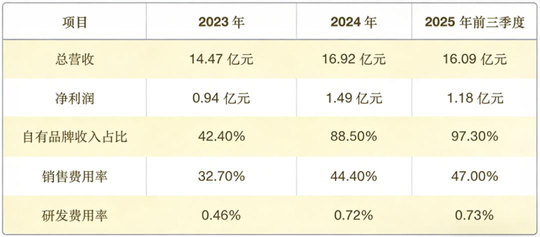 自有品牌的收入占比,从2023年的42.4%,直接飙到了2025年前三季度的97.3%——代理业务可以忽略不计了。公司的毛利率也从44.4%涨到了59.5%,卖自家货的利润率高达60.3%,而代理只有30.8%,差了一倍。