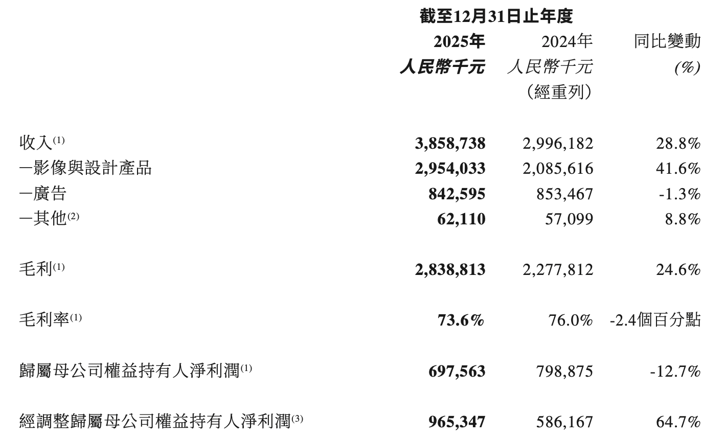 在2025年,美图的核心业务影像与设计产品实现收入29.5亿元,同比增长41.6%,对应的收入占比为76.5%,是拉动公司整体业绩增长的核心动能。