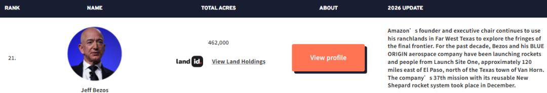 贝索斯排名第21位,一共持有46.2万英亩土地,相当于整个深圳市的大小。光是在得克萨斯州西部的一处牧场就占了42万英亩,这里不只是私人领地,更是他太空公司蓝色起源的火箭测试和回收基地。