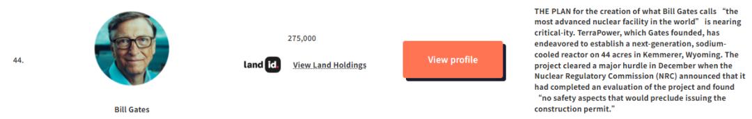 比尔·盖茨在这份榜单上的最新排名是第44位,比去年下滑了一位。他手里攥着27.5万英亩的土地,面积比香港地区略小一点,其中近25万英亩为高产农田,遍布17个州,稳坐美国头号“私人农田地主”。种植的作物包括胡萝卜、大豆和土豆等,有些直接送进了麦当劳的薯条生产线。