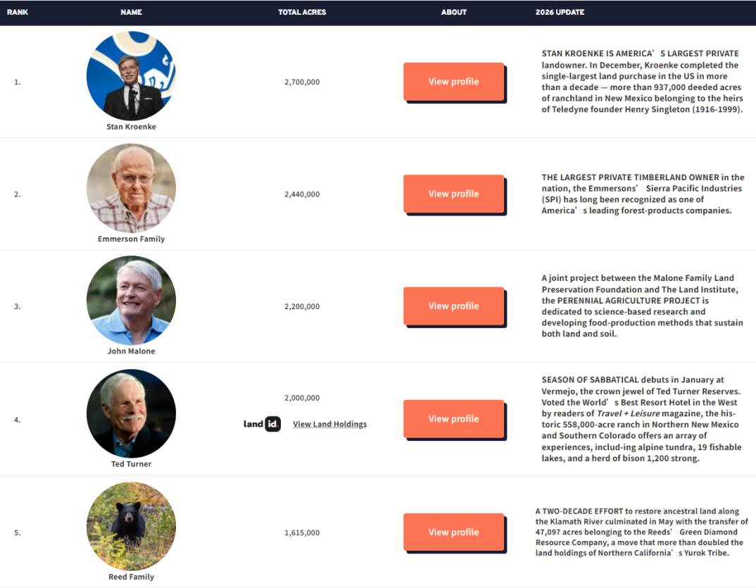 最近看到一份名为“美国百大地主”的榜单,着实让人吃了一惊。