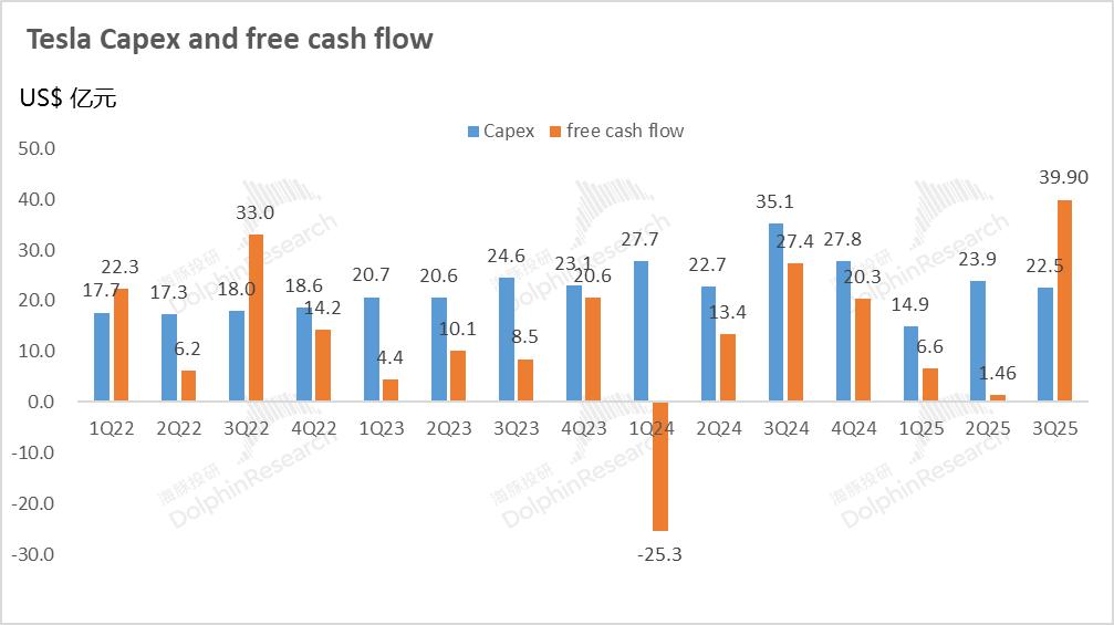 而资本开支本季度虽然环比上季度略有下行,但特斯拉指引今年的资本开支投入将达到90亿美元,隐含四季度资本开支28.7亿美元,环比本季度22.5亿还要在增长6.2亿美元,为FSD功能的再次大幅迭代,以及Robotaxi的商业化扩展做准备,同时2026年的资本开支指引还要再大幅增加。
