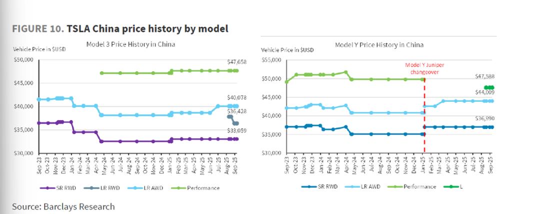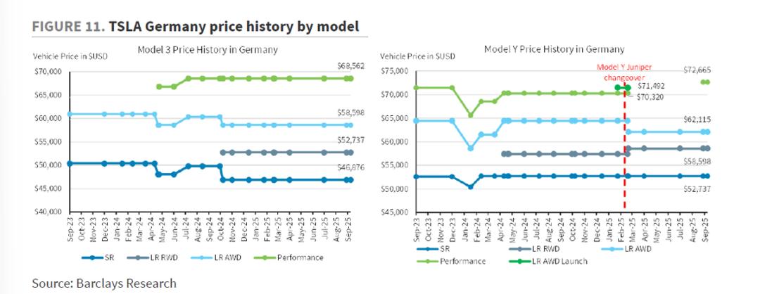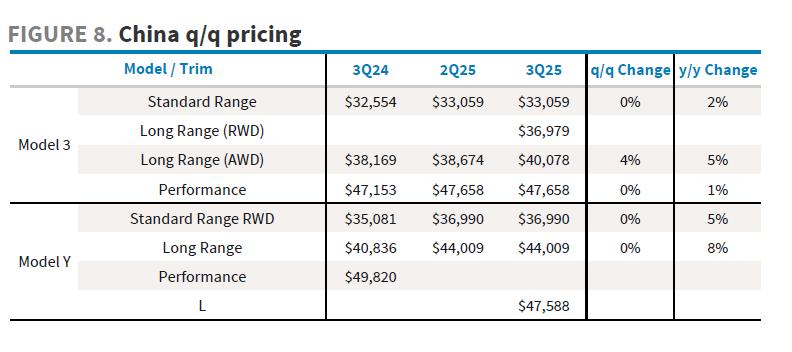3)欧洲市场:欧洲市场三季度表现较为一般,主要还是由于贸易战下消费者对美国产品的整体回避,以及 CEO 埃隆・马斯克涉足政治引发的品牌声誉受损。