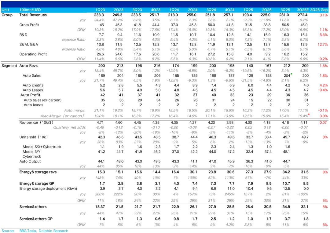 同时由于四季度销量的环比下滑,纯毛利的碳排放积分的继续下滑,以及关税成本对卖车的影响也会在四季度影响继续显现,四季度特斯拉卖车的毛利率预计继续呈现承压趋势。