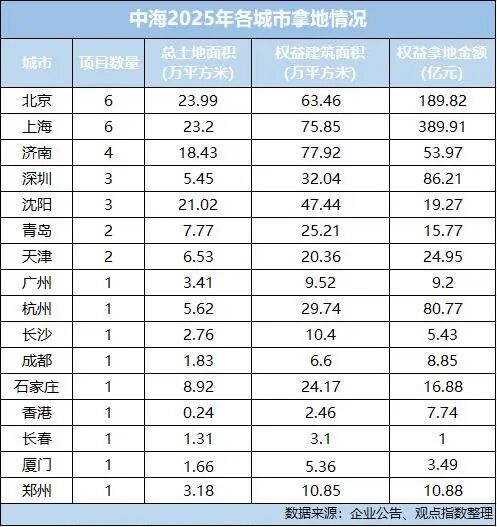 中海方面似乎也注意到了上述问题,2025年加大了土地市场的投资强度,尤其是在上海区域,投资金额从2024年68.6亿元增至390亿元,成为年内砸下最多资源的区域。