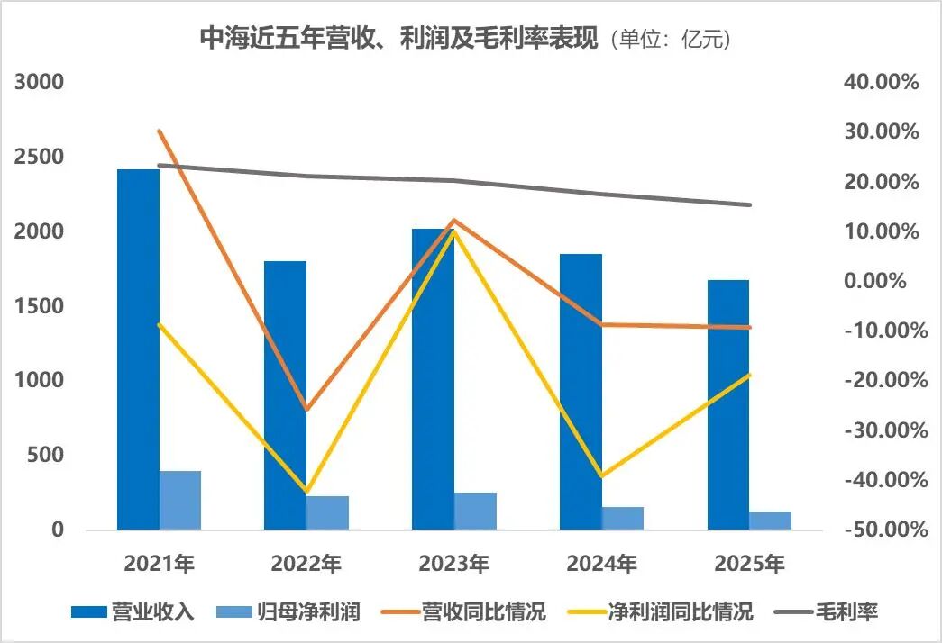 2025年业绩数据显示,中海报告期内收入为1680.9亿元,同比下降9.2%;毛利为260.6亿,同比下降20.4%,毛利率15.5%;净利润为134.3亿元,同比下降24.5%;归母净利润录得同比下降18.8%至126.9亿元,公司股东应占核心溢利为130.1亿元。