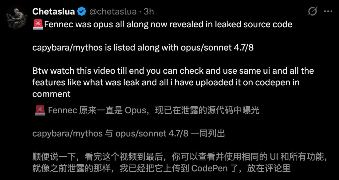 许多人还发现了最高层级Claude Mythos模型,代号Capybara,在代码中现身。