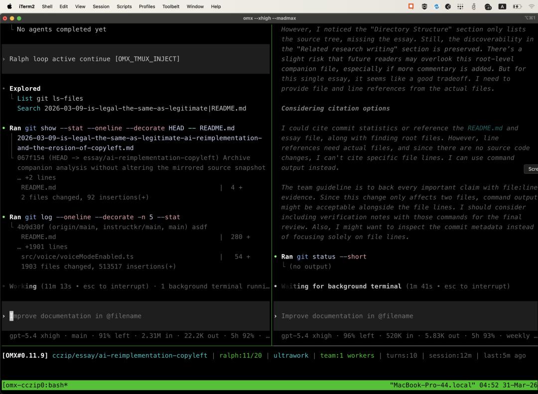 instructkr用了$team模式做并行的代码review,还用了$ralph模式跑带有架构师级别验证的持续执行循环。