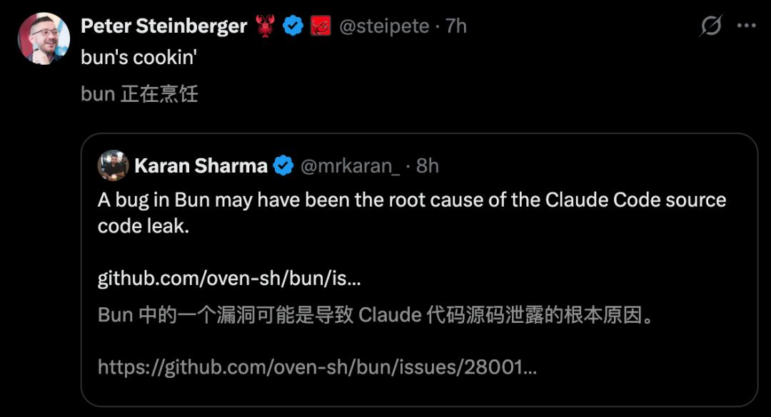 另有开发者发现,这次泄密可能是Bun中的一个漏洞导致,就连OpenClaw之父都下场关注了。