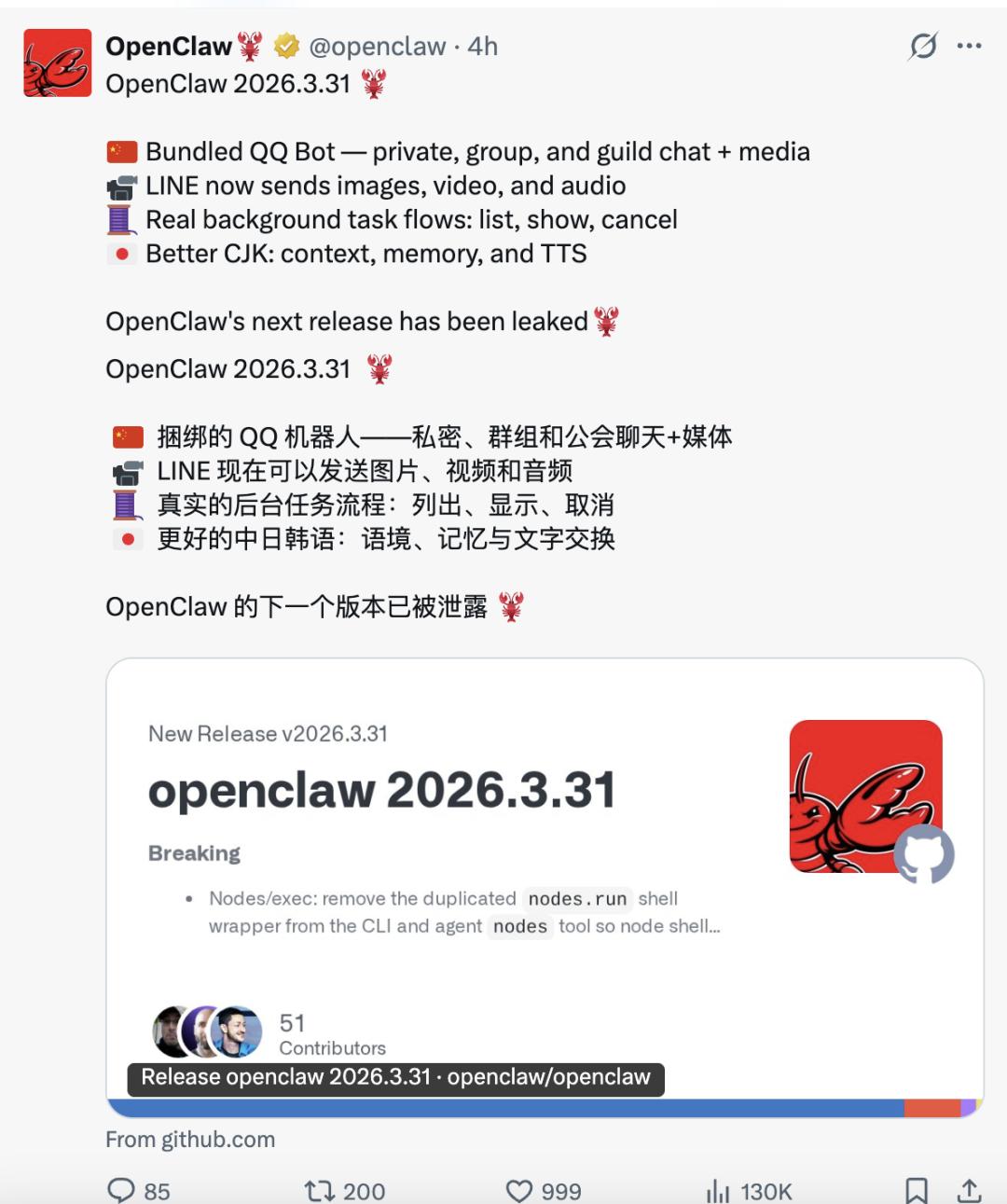 反观隔壁的OpenClaw,谈笑间又更,现在基本上是每周一到两更。