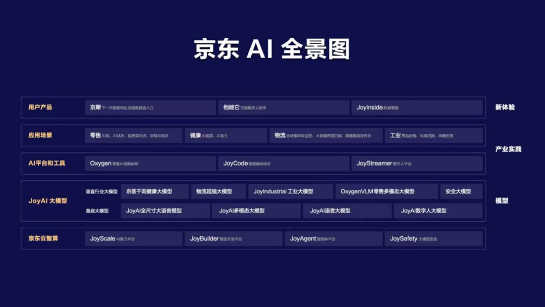 在之前的JDDiscovery-2025京东全球科技探索者大会上,京东正式发布AI全景图,系统展示其在人工智能领域的整体战略布局,并宣布未来三年将持续加大投入,推动构建万亿规模的人工智能生态。