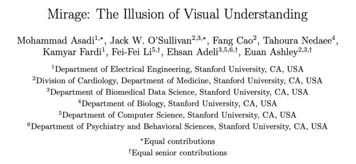 斯坦福大学上周发布的一篇论文就这件事进行了严肃验证,指出了这样的一个问题:当前许多多模态AI,在没有成功读取图像信息的情况下,并不会提示错误,而是煞有其事地编造出从看见到理解、再到推理的全过程,给出一个看似合理的结果。