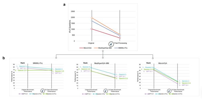 B-Clean的完整流程就是这样:把视觉基准测试中的图像全部去掉,让各个模型进行理解,如果模型在没有图的情况下还能答对,就说明这些题对模型的图像理解能力无效。把那些无效题删掉,最后剩下的,所有模型在没图的情况下都答不对的题目,才能真正考验模型的“视觉能力”。