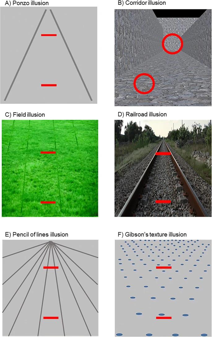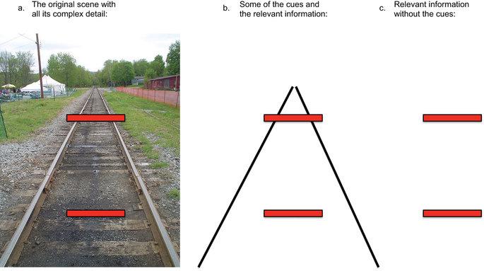 想象一条伸向远方的铁轨,两条铁轨线在视野尽头汇合。如果在两条铁轨之间放两个同样长度的枕木,位于远处(也就是铁轨间距更窄处)的那个枕木,看起来会比近处的更长。这就是庞佐错觉的经典演示。