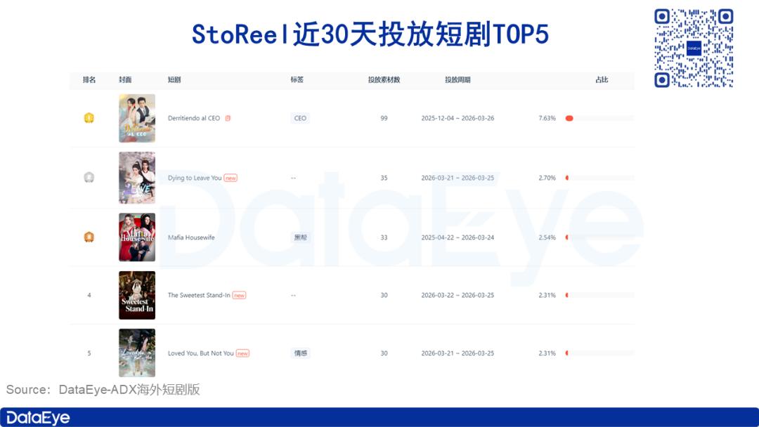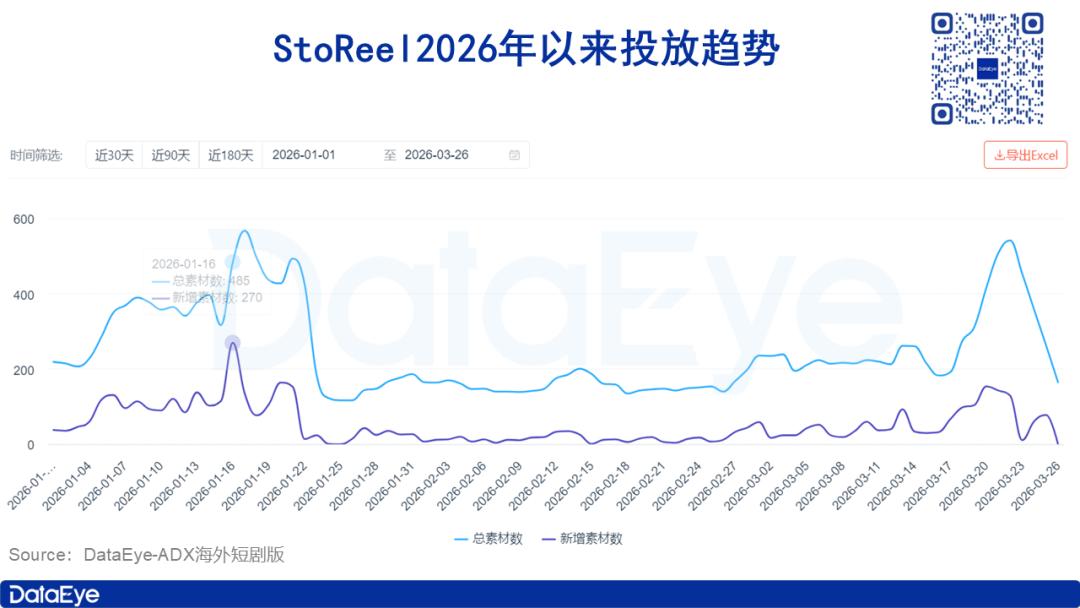从投放规模来看, StoReel整体投放量不高。 根据DataEye-ADX海外短剧版, 2026年至今, 其累计去重投放素材量仅超3800组。